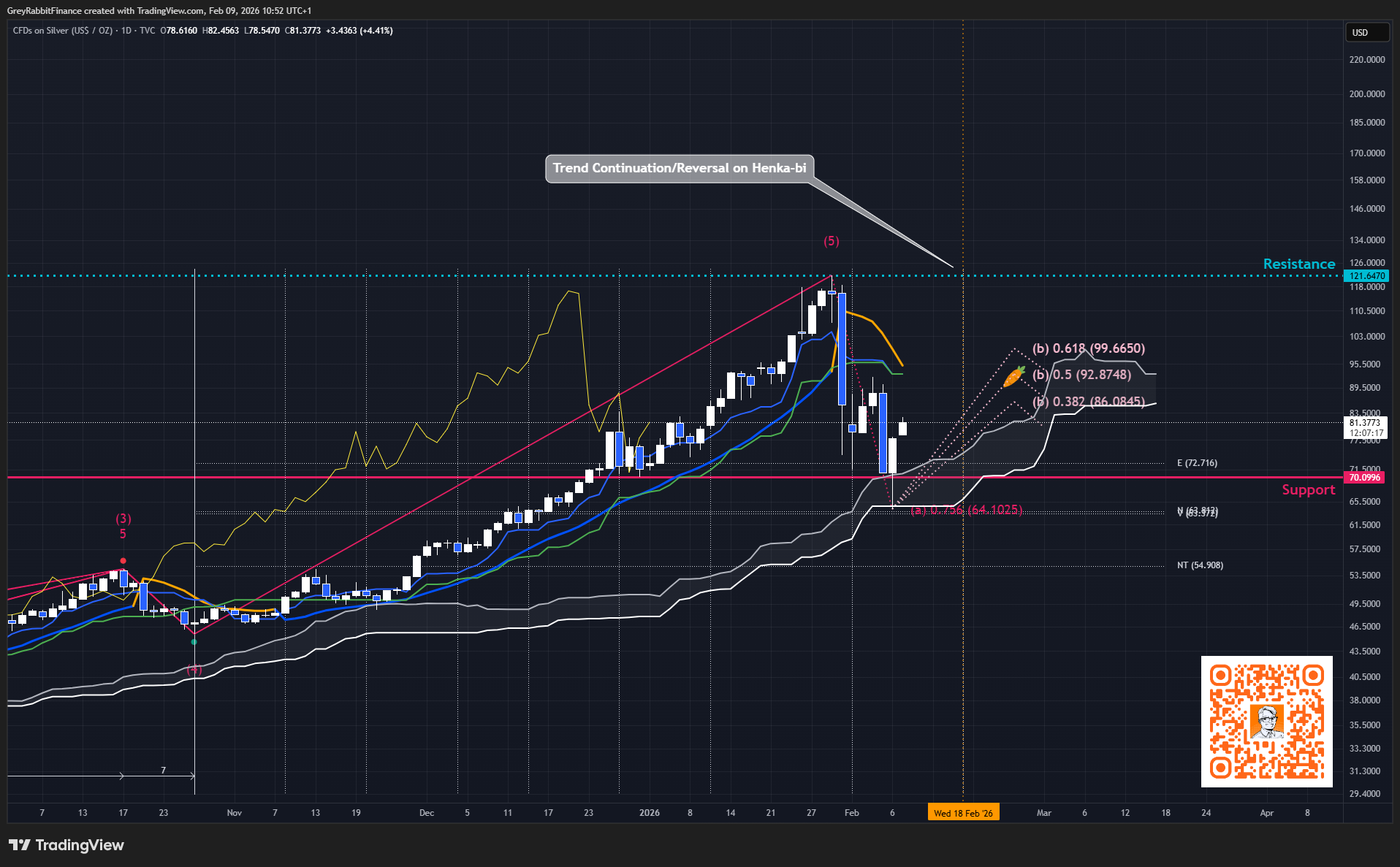 Wave (4) appears nearly complete and Silver is tracking toward a Feb 18 timing inflection that could initiate Wave (5) toward 121–126.