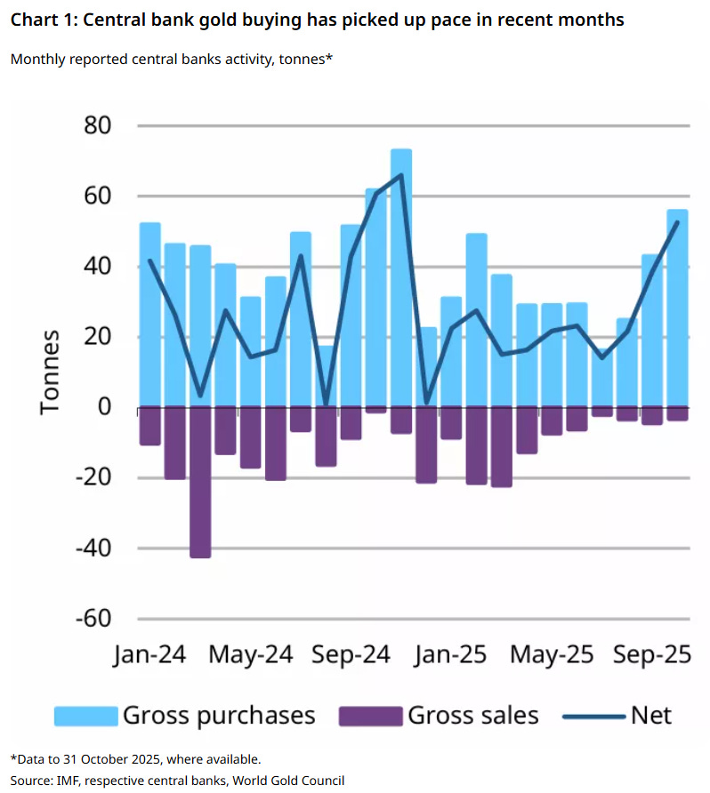 Net central bank gold purchases have re-accelerated in recent months as gross buying overwhelms intermittent selling. This behavior reflects long-term reserve diversification, not short-term trading. Central banks are responding to monetary fragmentation by increasing their exposure to hard collateral.