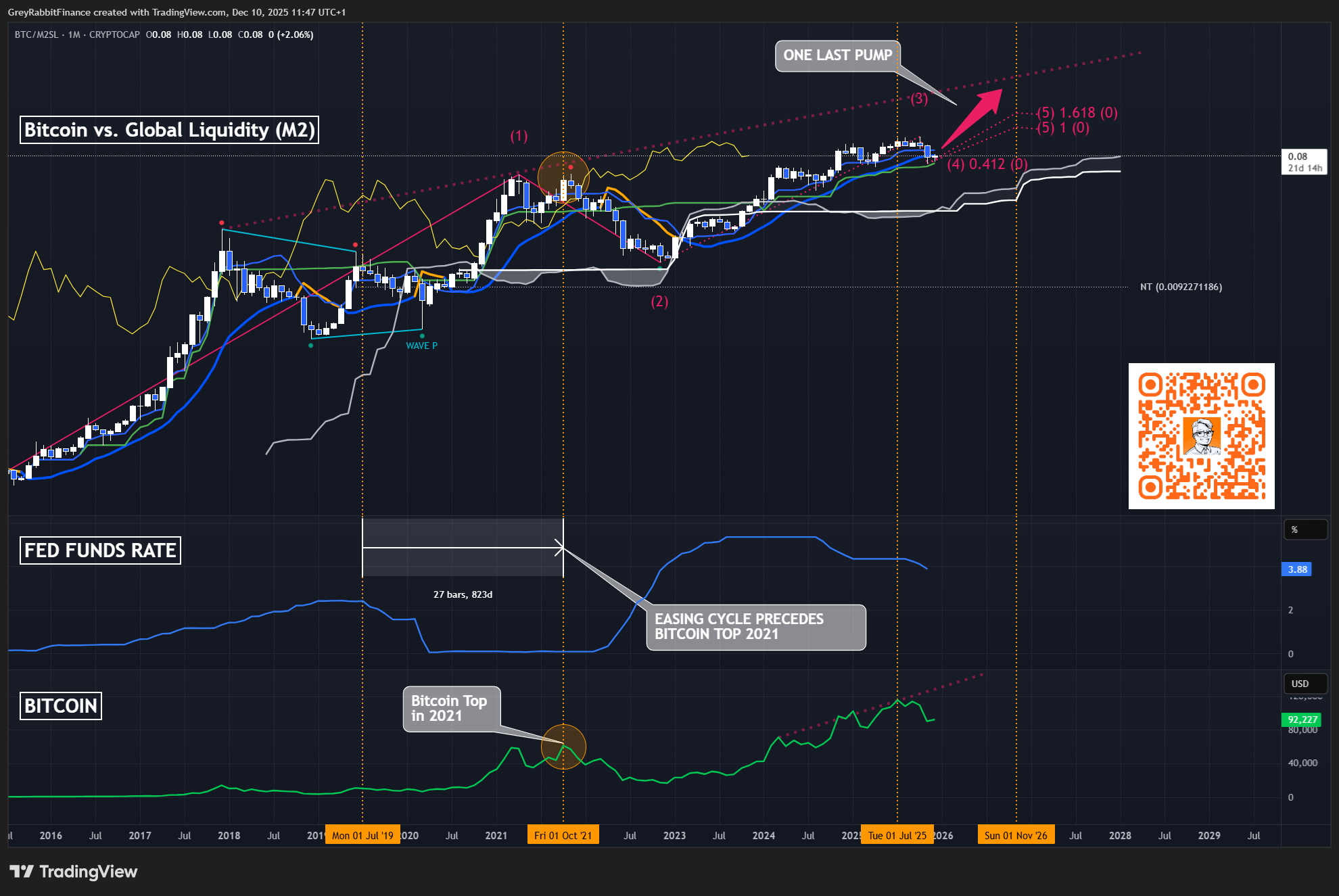 Every attempt to shrink the Fed’s balance sheet has followed the same script: tightening begins, financial stress emerges, and policy reverses back toward expansion. The recent QT phase has again compressed liquidity into a narrowing range. The projection shown here reflects the historical pattern… contraction gives way to a final, larger expansion. This is the mechanical basis for One Last Pump.