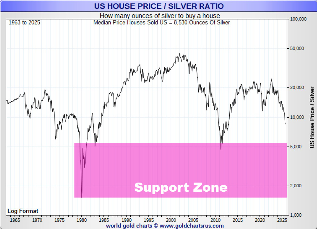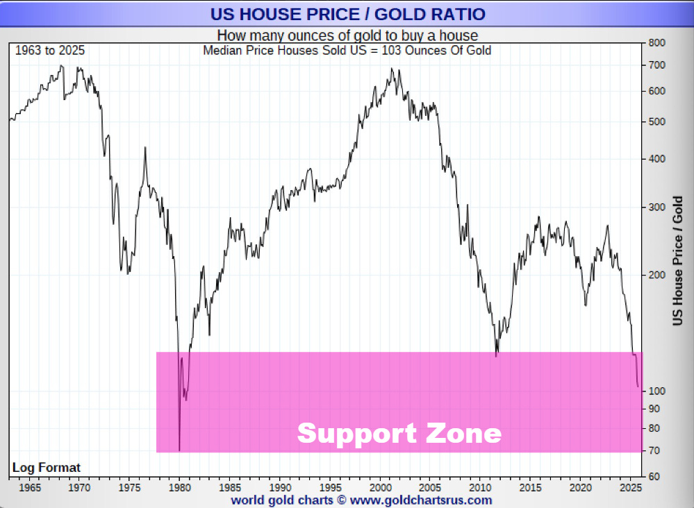 Every major monetary reset drives this ratio into the 70–130 oz support zone, where housing historically finds its hard-money cycle low (1980, 2011). Today, the ratio is once again descending toward that same structural floor signaling that housing is weakening in real terms even as nominal prices remain supported by policy.