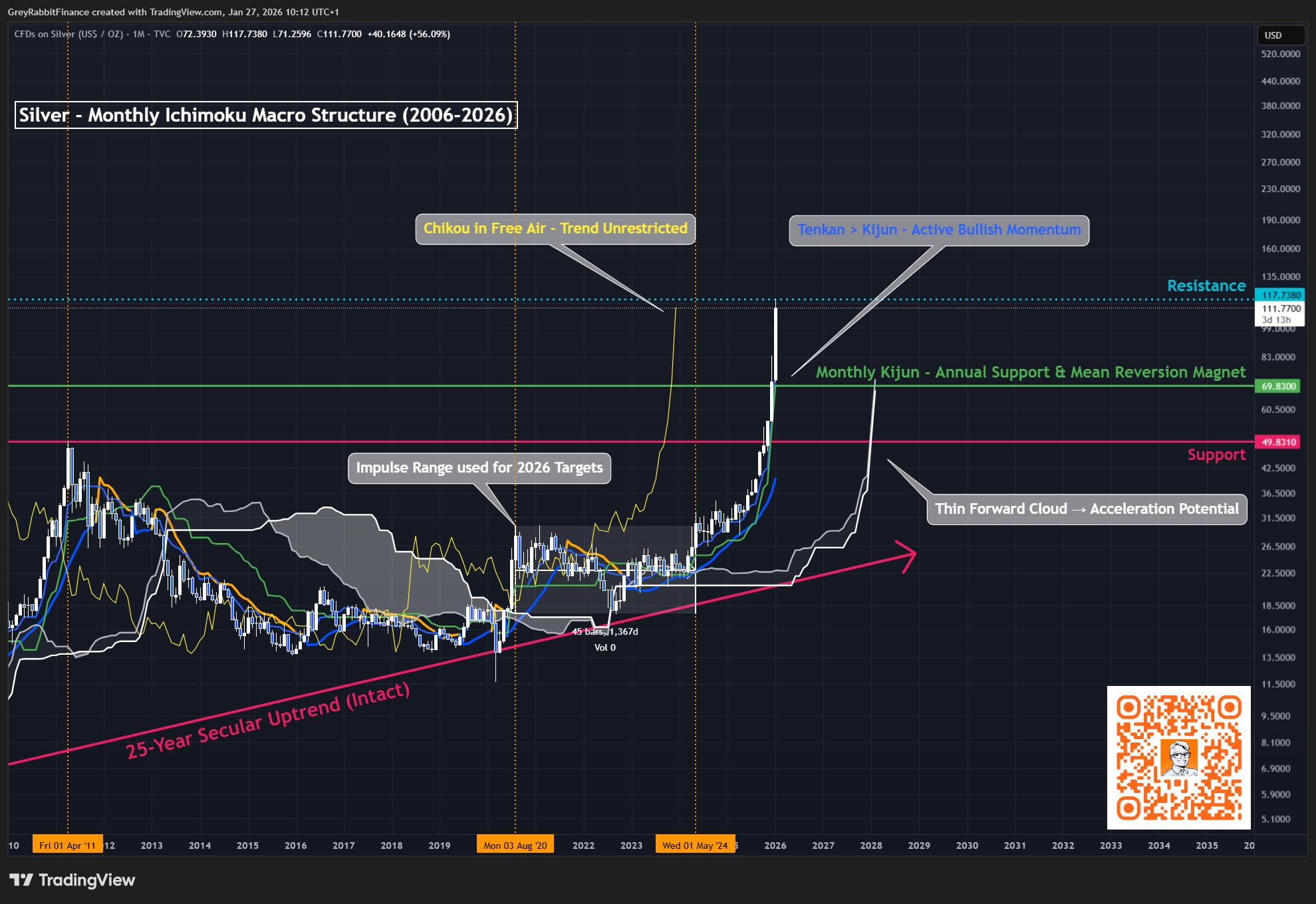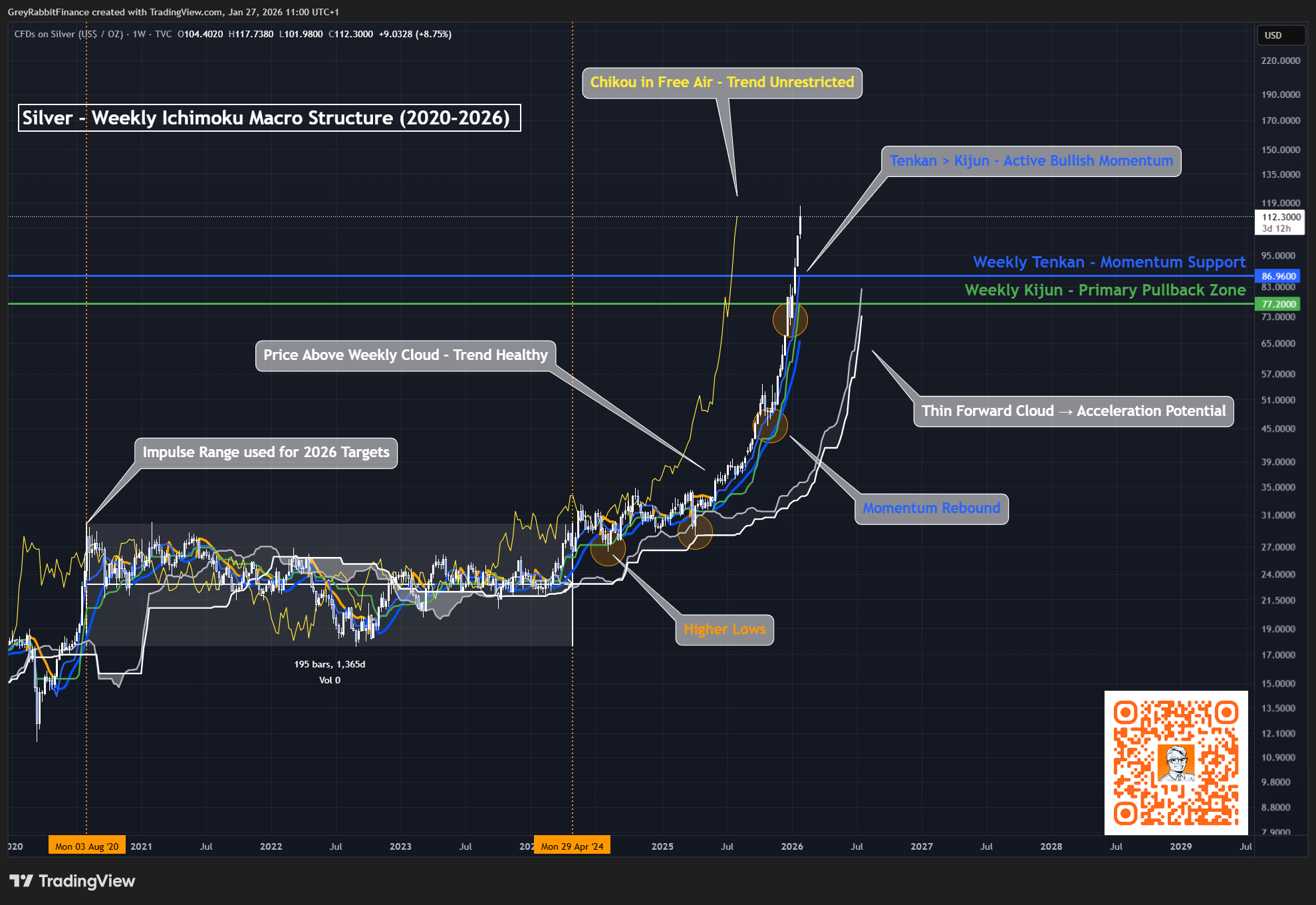 Price above the Monthly cloud, Tenkan > Kijun confirms active momentum, and the forward Kumo has thinned for the first time since the 2004–2011 bull market. Silver has fully transitioned into its expansion phase… this defines the 2026 baseline trend posture.