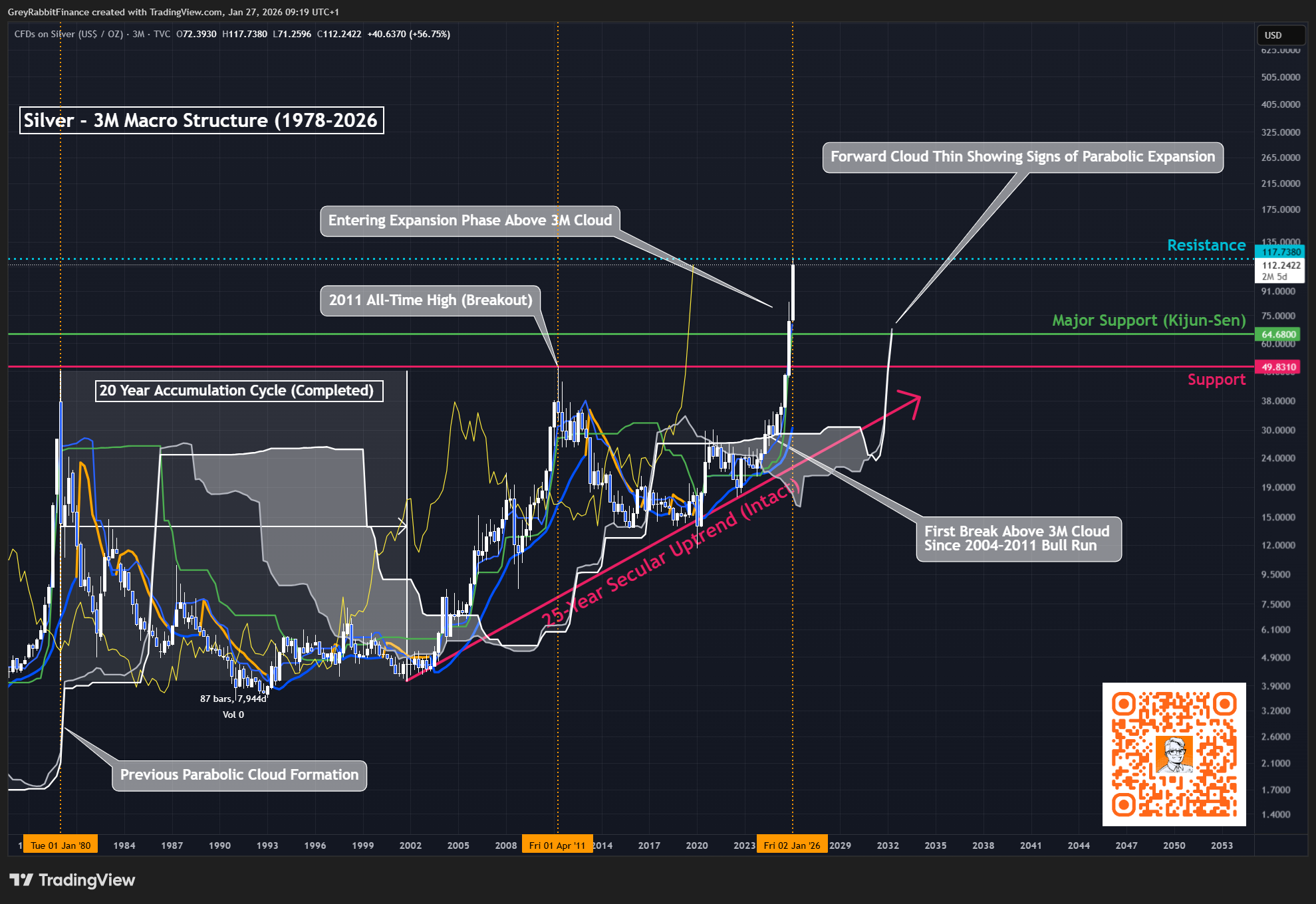 Silver’s 3-Month macro structure has officially entered its expansion phase for the first time since the 2004–2011 bull run. The 20-year accumulation cycle is complete, the 25-year secular uptrend remains intact, and price has now broken above the 3M cloud. Forward cloud thinning signals early parabolic conditions as we approach the 2026 cycle window.