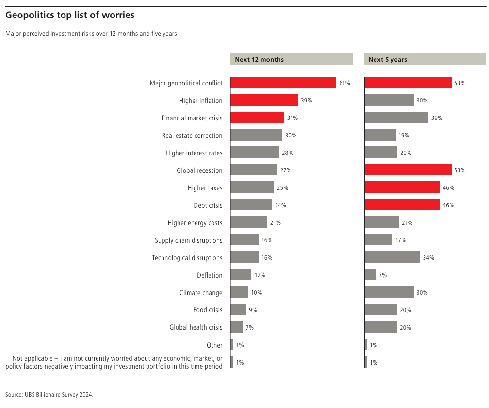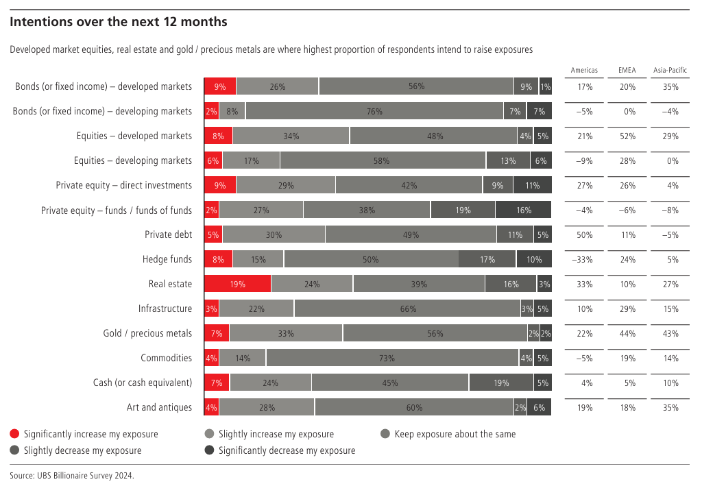 According to UBS’s 2024 Billionaire Ambitions Report, the ultra-elite are reallocating toward tangible assets and alternative investments: