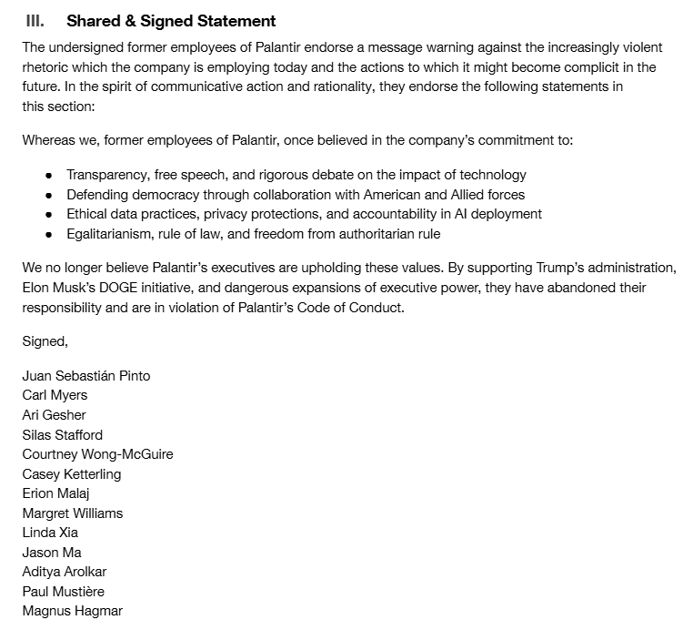 Thirteen former Palantirr employees even published an open letter warning that the technology is ripe for political targeting and authoritarian abuse.